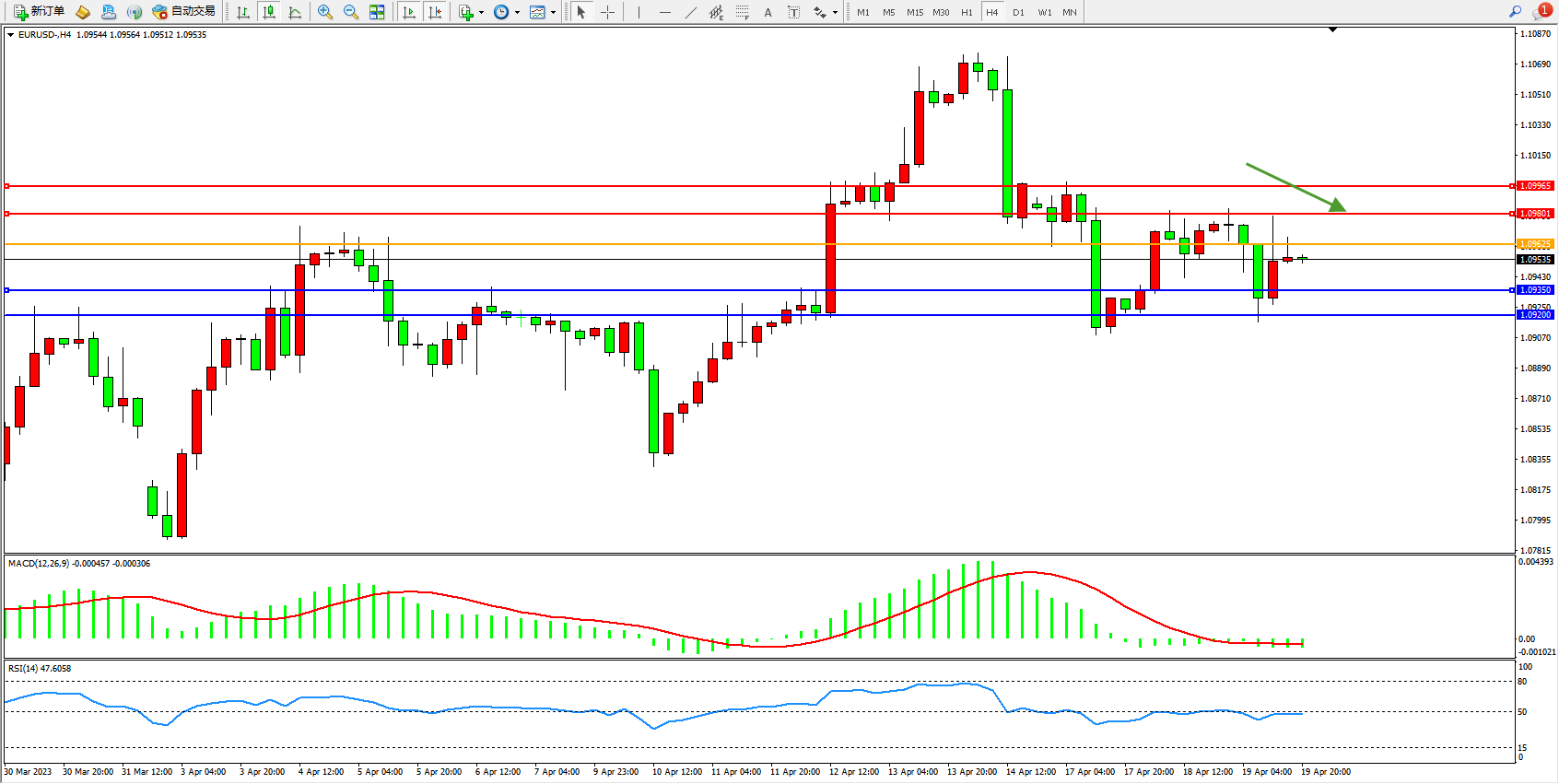 欧元美元EURUSD—4小时K线图显示: