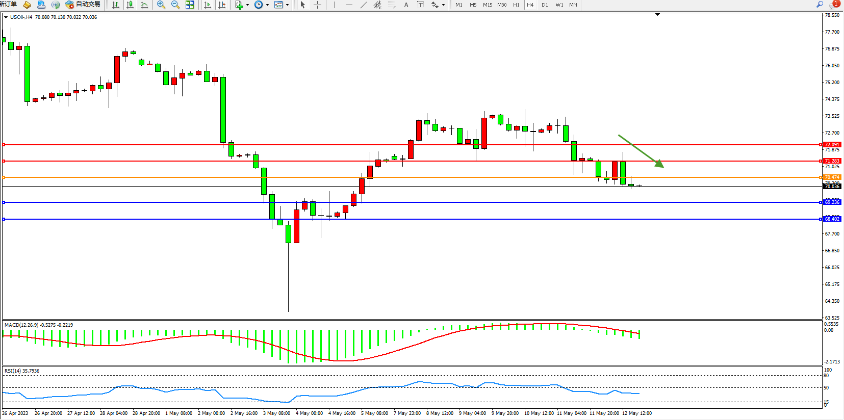 交易策略:70.474下方看跌,目标69.236  68.402