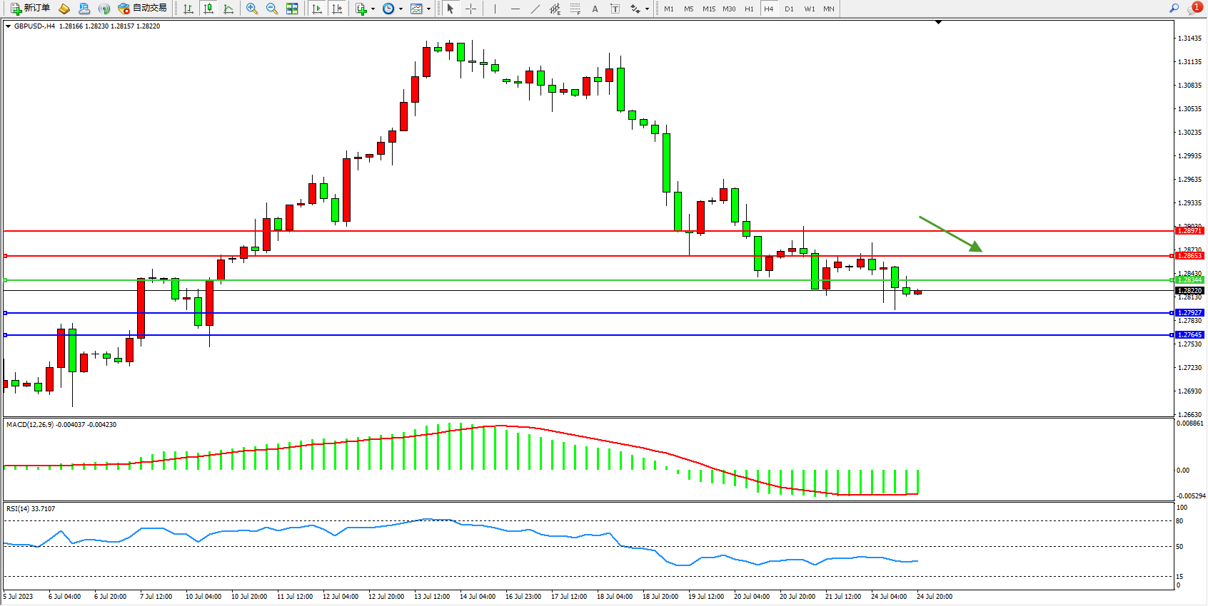 交易策略:1.28344下方看跌,目标1.27927  1.27645