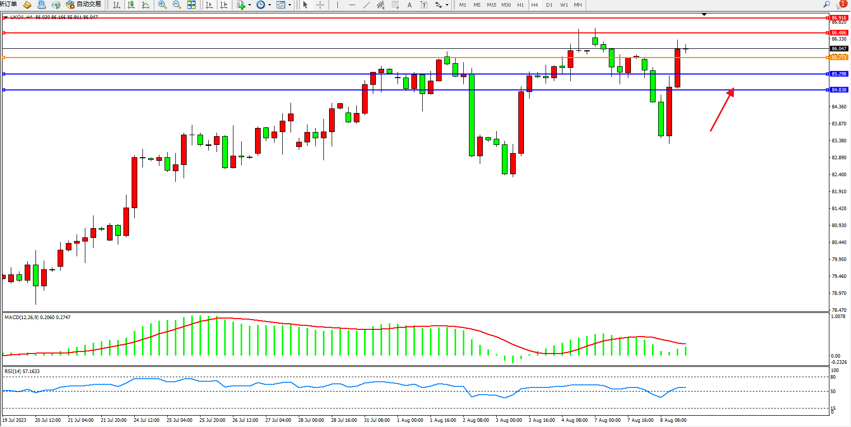 布油维持86.047附近震荡,布伦特原油期货价格上涨至每桶80美元以上,沙特阿拉伯仍决定将减产期限延长至9月,这表明该国的目标价格可能高于80美元。