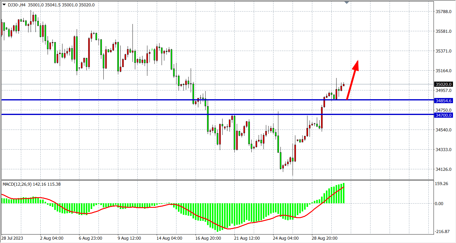 4小时图看,道指进一步走高至35000附近,MACD量能在零轴上放量,上方继续看35200-35500。