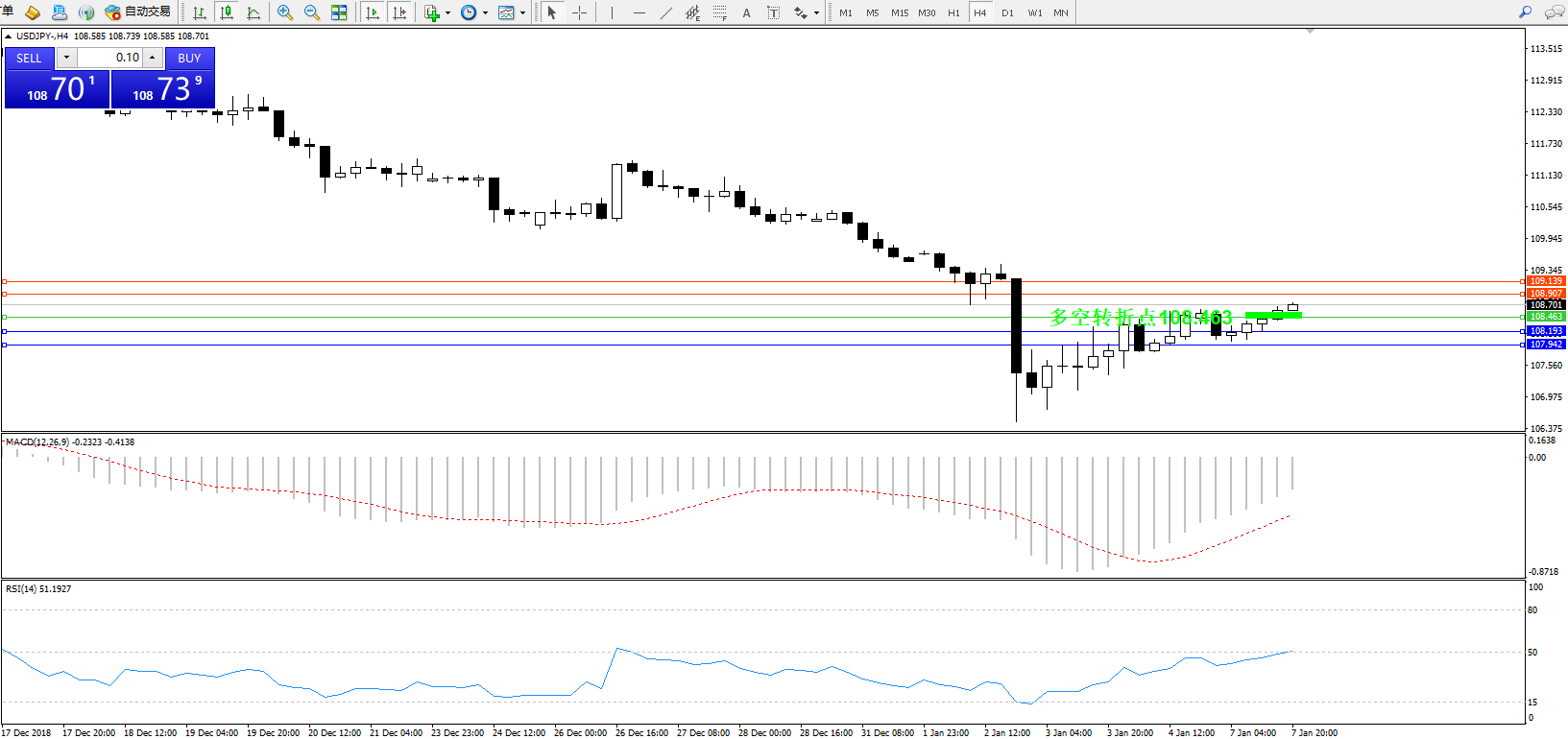 交易策略:108.463上方看涨,目标108.907、109.139