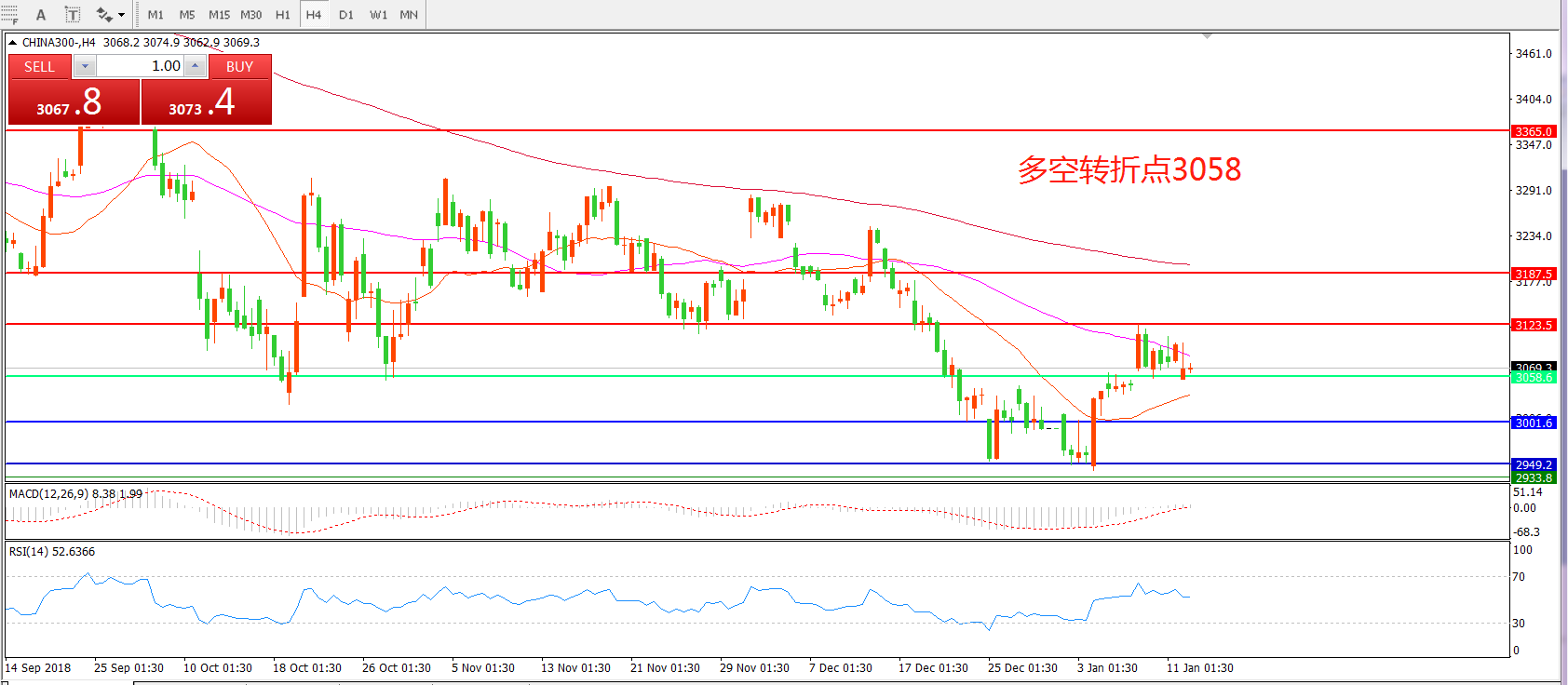 1小时图看,CHINA300中华指数收复3000后陷入整理,均线系统走平, MACD绿柱减少,短期反弹成为可能,中期仍以震荡思路对待。