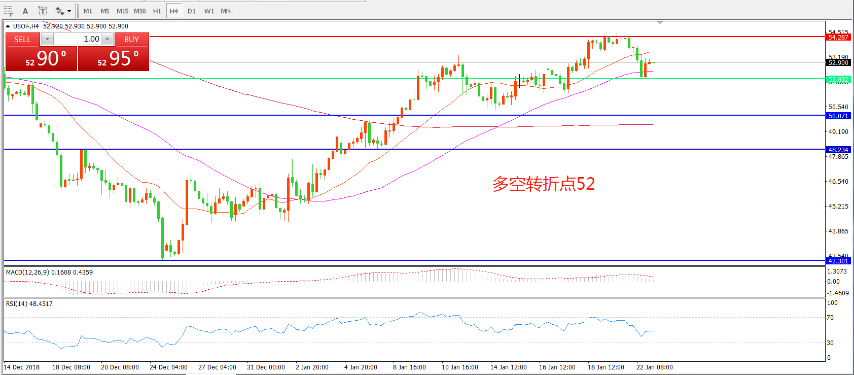 4小时图看,油价经过连续整理站稳52美元,短期整理后受制于54美元关口, 均线系统呈多头排列, MACD红柱增加,重点关注上方阻力。