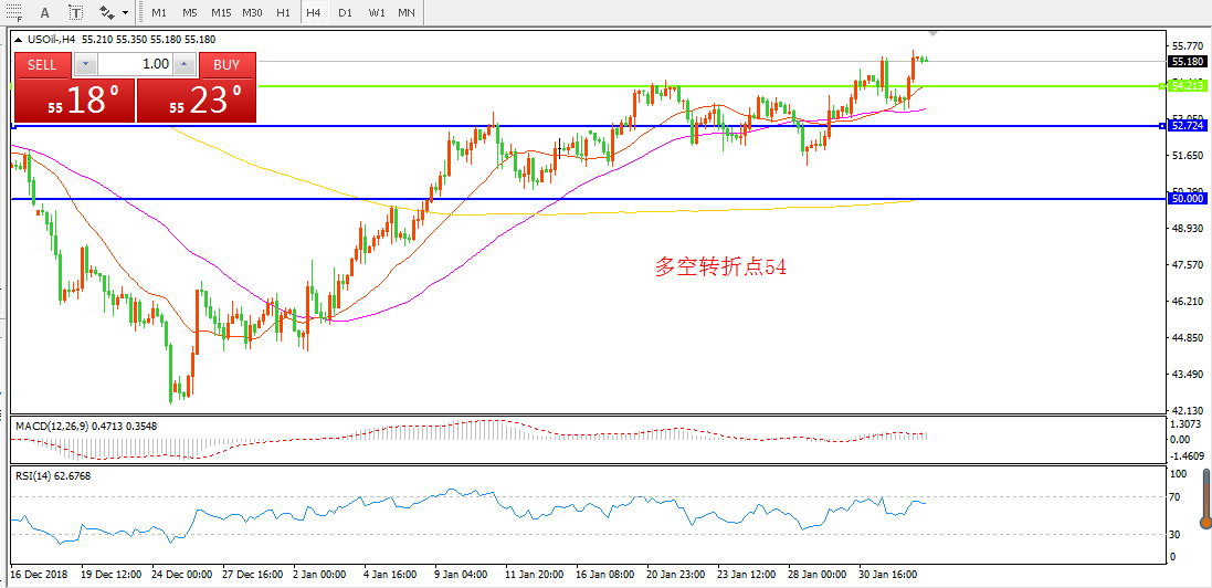 4小时图看,油价强势突破55美金后延续震荡,整体价格处于均线支撑之上。短期均线向上, MACD红柱增加,亚盘时段如有所回落可逢低做多。