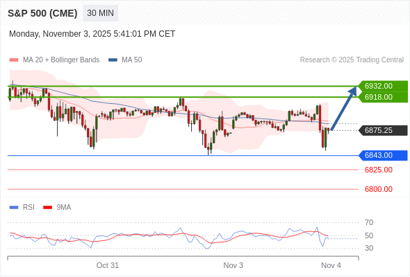 在 6843.00 之上,看涨,目标价位为 6918.00 ,然后为 6932.00 。
