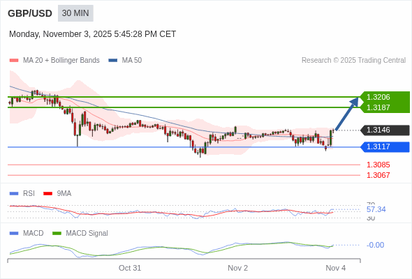 英镑/美元 当日内 : 看涨,当 1.3117 未被跌破。