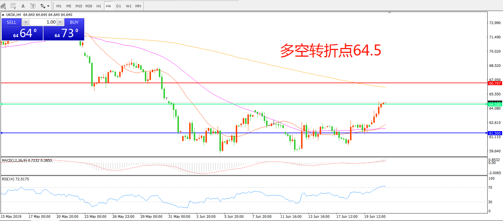 周四(6月20日)美国官方确认,美国海军一架MQ-4C“海神”高空无人机在飞越霍尔木兹海峡国际空域时被伊朗地对空导弹击落。而美国总统特朗普周四在推特中声称伊朗犯了一个“非常大的错误”。 这加剧了人们对两国冲突的担忧。俄罗斯和美国之前刚刚撕毁了《中导条约》,这更令全球投资者感到不安。中东地区过去许多年来已经成为了美俄隔空斗法的主战场,而一旦中东局势有变,当地原油生产与外运设施的安危都将再度成疑,这足以让大家对于中东原油供给的连续性前景绷紧神经。地缘紧张局势助推布油日内涨超4%,收报64.64美油/桶。