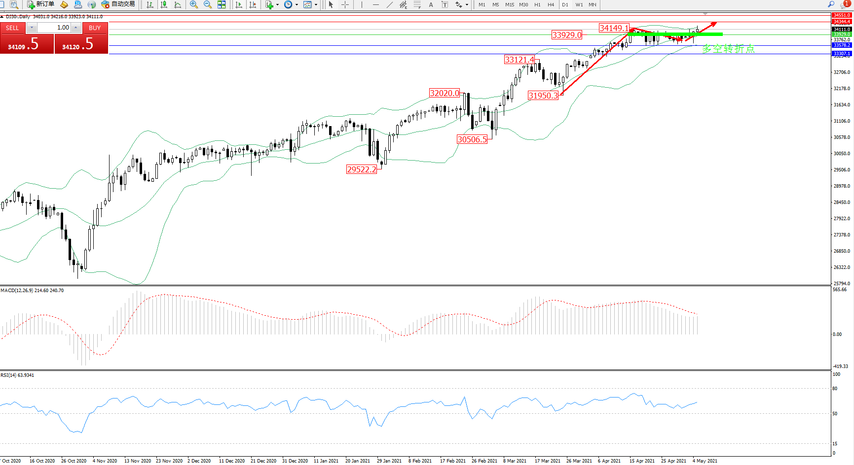 道琼斯指数5月5日(周三)收盘上涨96.99点,涨幅0.28%,报34230.02点;美国4月ADP就业不及预期,数据出炉后美元指数进一步走软,不及预期的ADP就业报告可能拖累4月非农就业人口增幅低于100万大关,不过冒险交易者们可能乐见ADP就业报告,该数据显示美国经济增长快速改善,但改善的速度并没有快到足以令美联储重新考虑货币政策立场。美联储官员表示,尽管政府为应对新冠疫情批准了前所未有的财政支出计划,但美国的通货膨胀不太可能失控。这种态度强化了人们关于决策者将保持利率在低水平的预期,美联储理事鲍曼在其他场合也发表了类似观点,暗示尽管美国经济增长前景改善,但通胀率持续高于2%目标的可能性 “似乎仍然很低。