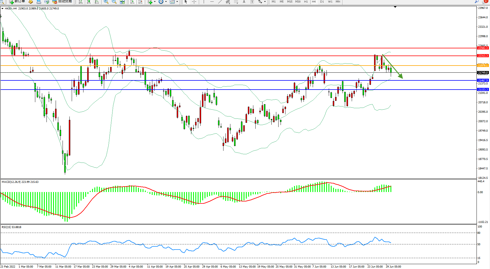 香港恒生指数6月30日(周四)收盘下跌137.1点,跌幅0.62%,报21859.79点;港股午后现跳水行情,恒生科技指数一度跌至2.5%,尾盘回升仍收跌1.36%,且失守4900点,港股上半年收官,科技股普遍下跌,作为市场风向标的权重科技股集体低迷,美团跌超4%,腾讯跌2.9%,阿里巴巴跌超2%。上周五香港交易所 香港特别行政区成立纪念日,休市一日。