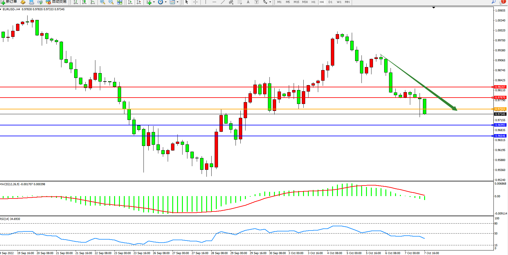 4小时图看:高位空头动力呈阶梯式震荡下行,短期跌势未见止步,有进一步向下移动态势,MACD指标处于0轴线下侧弱势徘徊,RSI指标处于50均衡线下侧弱势整理;